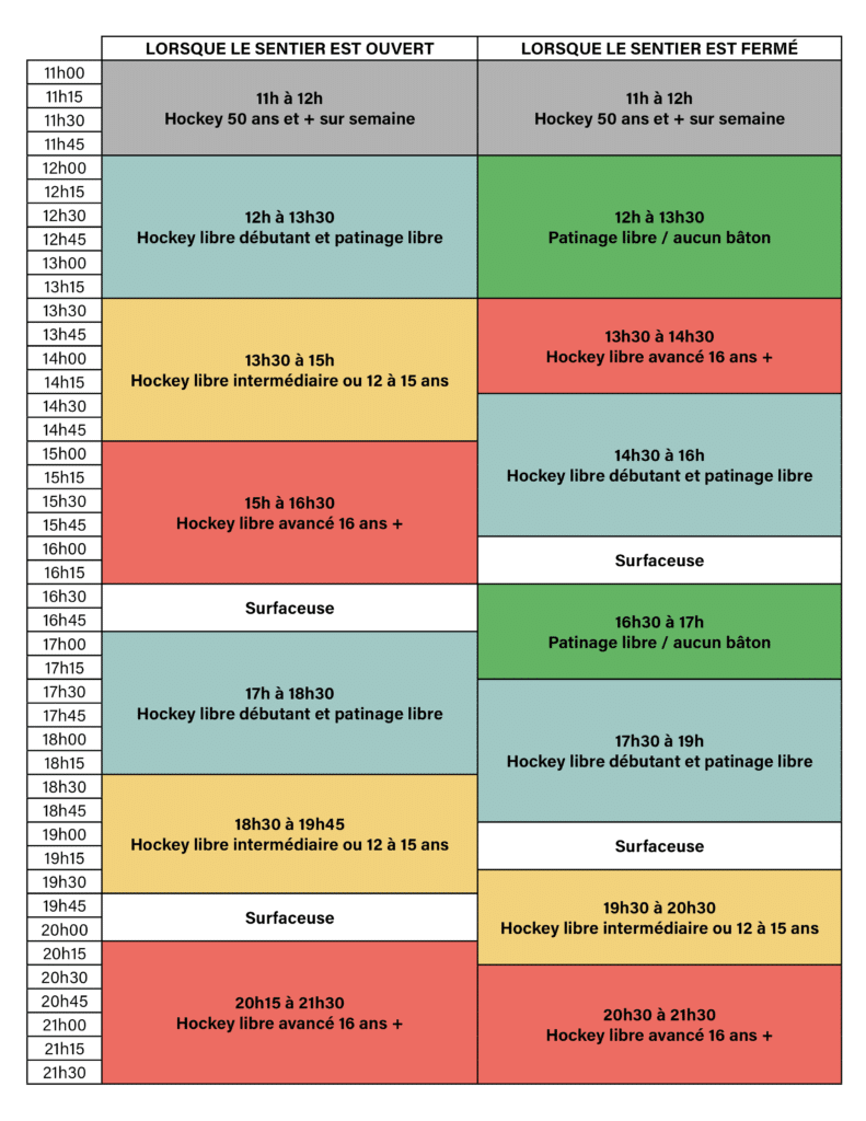 Pour que tous puissent profiter du patinage, l’horaire de la patinoire varie selon l’ouverture du sentier. Consultez la page Facebook Patinoire SGDV avant de vous déplacer. L’horaire en vigueur est aussi affichée sur place. Voici les deux scénarios d’horaire (sentier ouvert, sentier fermé) :