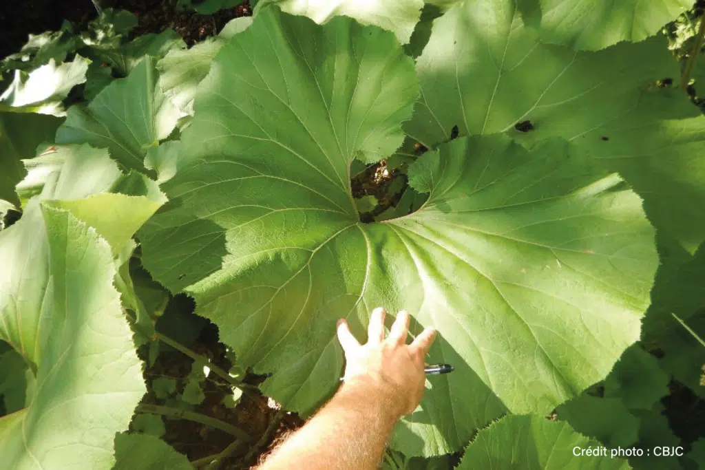 - Identification : Le pétasite du Japon (Petasites japonicus) a des feuilles circulaires en forme de rein, atteignant jusqu’à 1,5 m de diamètre. Sa tige coriace peut mesurer jusqu’à 1 mètre de hauteur.